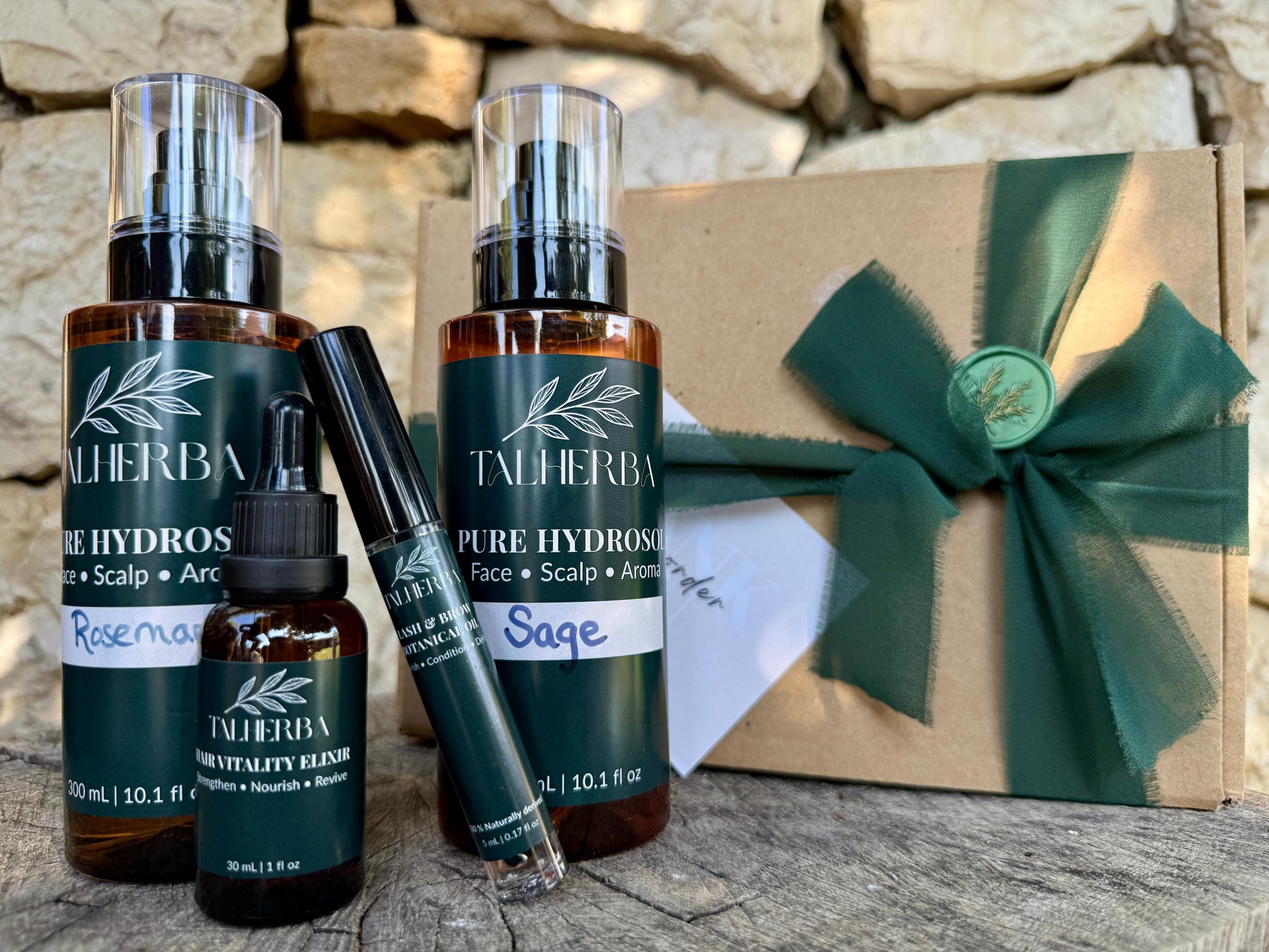 Includes: Hair & Beard Elixir 30 ml + Rosemary Hydrosol 300 ml + Sage Hydrosol 300 ml + Lash & Brow Oil + Free Gift Box
